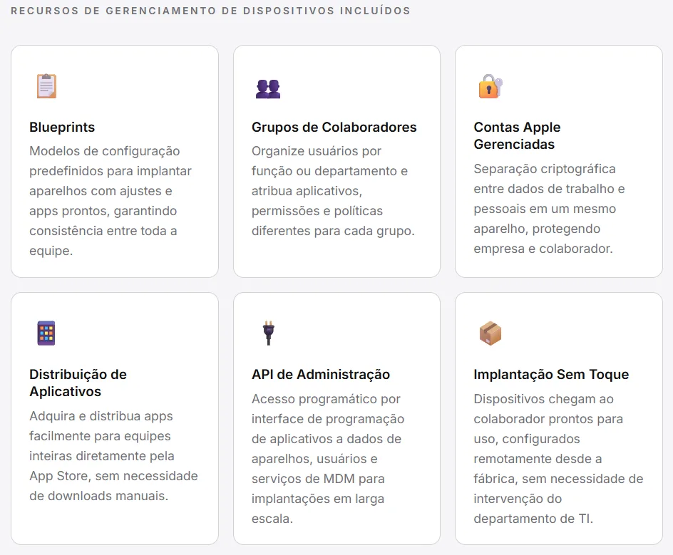 O MDM gratuito com Blueprints elimina boa parte do trabalho manual de configurar dispositivos, e os serviços de e-mail e calendário corporativos com domínio próprio conferem profissionalismo à comunicação sem necessidade de contratar ferramentas de terceiros.