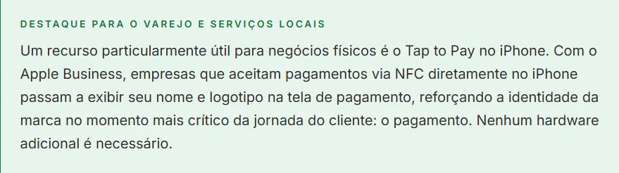 Para quem nunca utilizou o Apple Business Connect, essa é a primeira oportunidade de configurar como a empresa aparece para os usuários de iPhone e Mac em aplicativos como Mapas, Safari, Spotlight, Carteira e Mail.