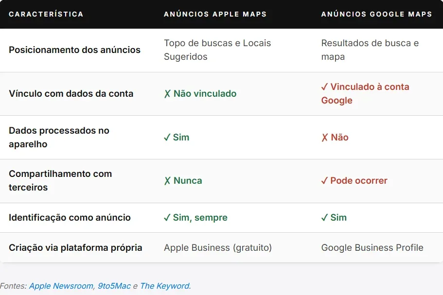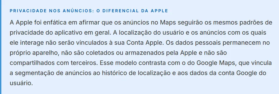 A chegada dos anúncios no Apple Maps é o elemento que completa o ciclo: a Apple passa a competir diretamente com o Google no mercado de publicidade local, trazendo para isso uma proposta diferenciada pelo modelo de privacidade.
