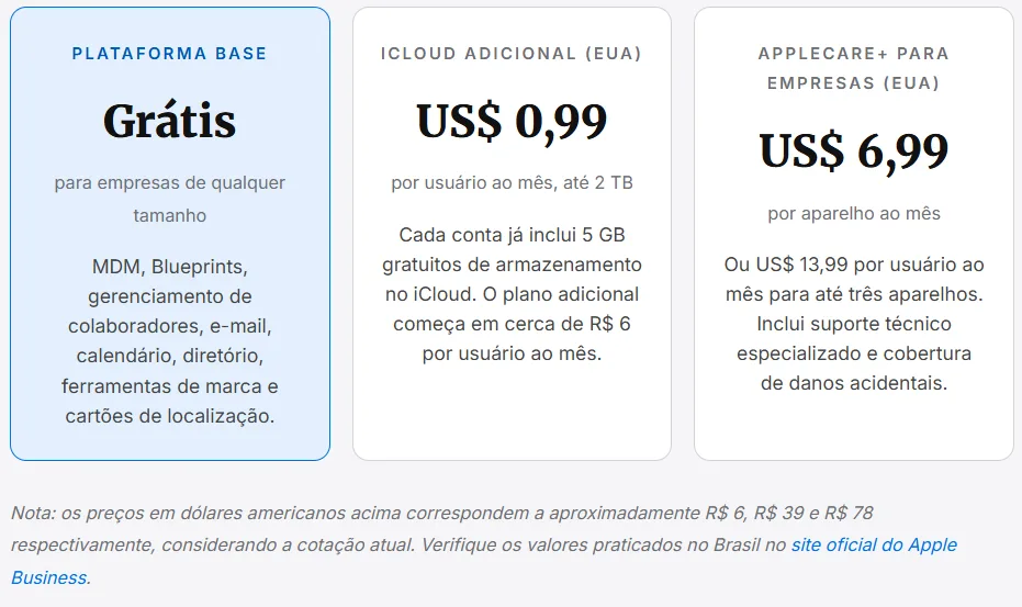 A proposta de valor central do Apple Business é clara: a plataforma base é inteiramente gratuita. Isso inclui o MDM, os Blueprints de configuração, o gerenciamento de colaboradores, as ferramentas de marca, os cartões de localização no Mapas, os insights de localização e os serviços de e-mail e calendário corporativos.