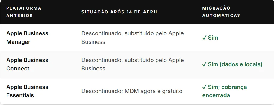 Com o lançamento do Apple Business em 14 de abril, as três plataformas anteriores deixarão de estar disponíveis. A transição, no entanto, foi planejada para ser automática e sem perda de dados para os usuários atuais.