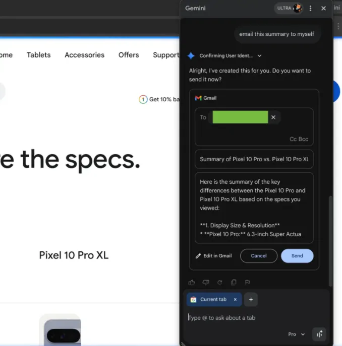 Em relação à segurança, o Gemini no Chrome solicita confirmação explícita do usuário antes de executar ações sensíveis, como enviar um e-mail ou adicionar um evento ao calendário. Nenhuma ação irreversível é executada sem aprovação manual do usuário.