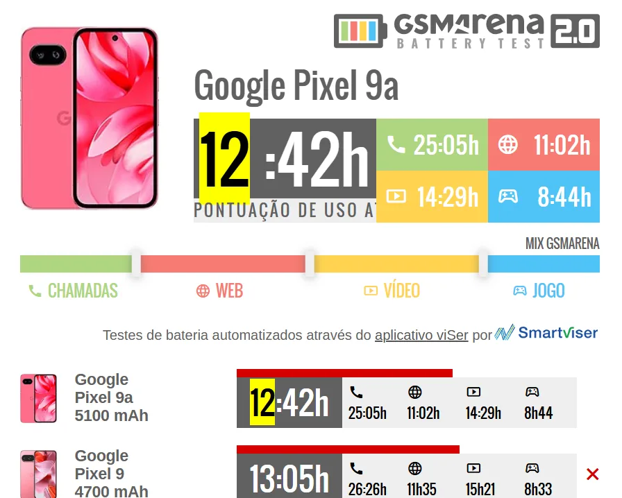Em testes realizados pelo portal GSMArena com o Pixel 9a, que usa o mesmo chip e a mesma bateria, o aparelho atingiu 12 horas e 42 minutos de uso ativo. Esse dado dá uma ideia realista do que esperar do Pixel 10a em condições práticas de uso.