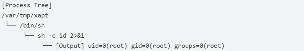 A Mandiant revelou uma árvore de processos suspeita: O arquivo binário localizado no caminho /var/tmp/xapt iniciou um shell com privilégios de administrador (root) e executou o comando de reconhecimento do sistema para recuperar os identificadores de usuário e de grupo da máquina.