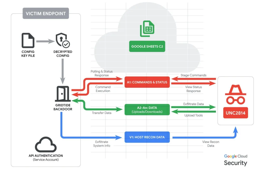 Em vez de depender das falhas de segurança nos produtos do Google ou de ferramentas maliciosas facilmente detectáveis, o grupo explorou uma funcionalidade completamente legítima: as chamadas de API para o Google Sheets, o serviço de planilhas online da empresa. Uma planilha comum foi transformada em um canal de comando e controle de uma operação de espionagem internacional.
