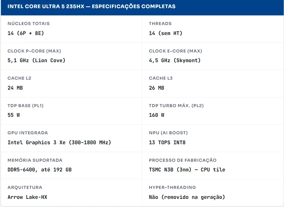 Especificações Técnicas do Intel Core Ultra 5 235HX