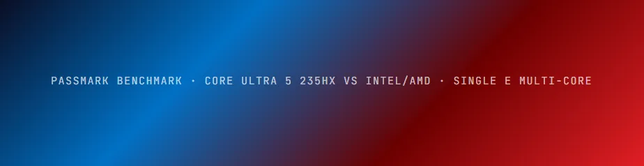 Conforme documentado pelo Wccftech, o Core Ultra 5 235HX foi testado duas vezes no PassMark, com os seguintes resultados médios: 4.708 pontos em single-core e 40.122 pontos em multi-core. Esses números, comparados aos processadores que o antecedem e aos seus concorrentes, contam uma história fascinante sobre o que a arquitetura Arrow Lake entrega em notebooks.
