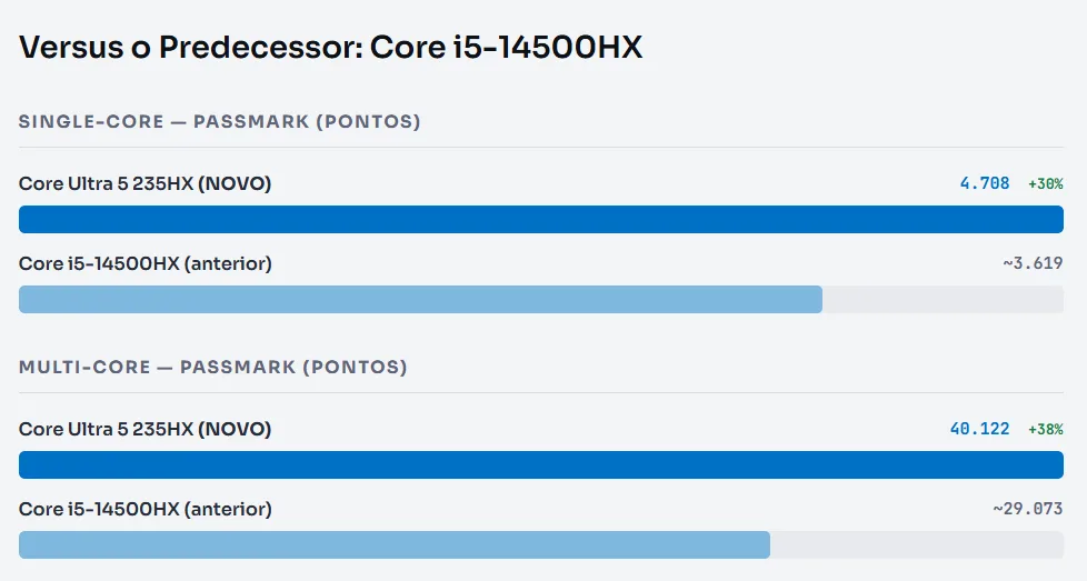 A comparação direta com o predecessor direto, o Core i5-14500HX, mostra o nível da progressão geracional. Um ganho de 30% em single-core e 38% em multi-core é substancial para uma atualização dentro da mesma categoria de preço.