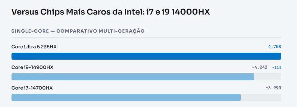 Sim. Conforme dados do NotebookCheck e do banco de resultados do Geekbench, o Core Ultra 5 235HX marcou aproximadamente 1.767 pontos em single-core e 11.564 pontos em multi-core no Geekbench 6.6. Em single-thread, ele fica na mesma faixa dos melhores processadores portáteis de gerações anteriores. Os resultados do Geekbench tendem a ser mais conservadores do que o PassMark para esse chip porque o Geekbench pesa mais o desempenho de núcleo único puro.