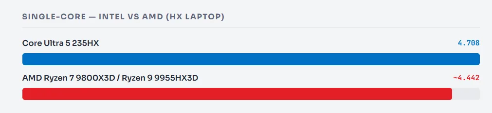 O Core Ultra 5 235HX marcou 4.708 pontos em single-core e 40.122 em multi-core no PassMark. Isso representa 30% e 38% a mais que o Core i5-14500HX anterior, respectivamente. Em single-thread, o chip supera até o Core i9-14900HX em 11% — e bate o Ryzen 7 9800X3D e o Ryzen 9 9955HX3D da AMD em desempenho de núcleo único por cerca de 6%.