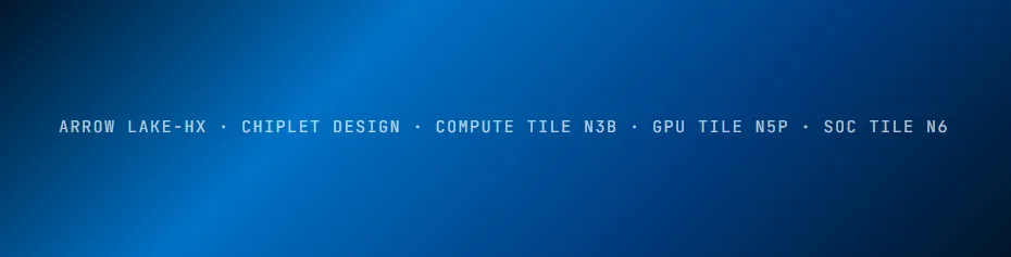 O Arrow Lake-HX adota a arquitetura de chiplets, ou tiles, interligados pela tecnologia Foveros 3D da Intel. Conforme explicado pelo PCWorld, o chip é composto por múltiplos tiles separados: o Tile de Computação (onde ficam os núcleos do processador), o Tile de GPU, o Tile de SoC e o Tile de I/O. Cada tile é fabricado com o processo de fabricação mais adequado para sua função.
