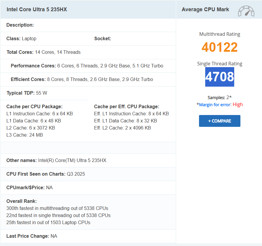 First Passmark 2 Samples of 235HX vs 14500HX: