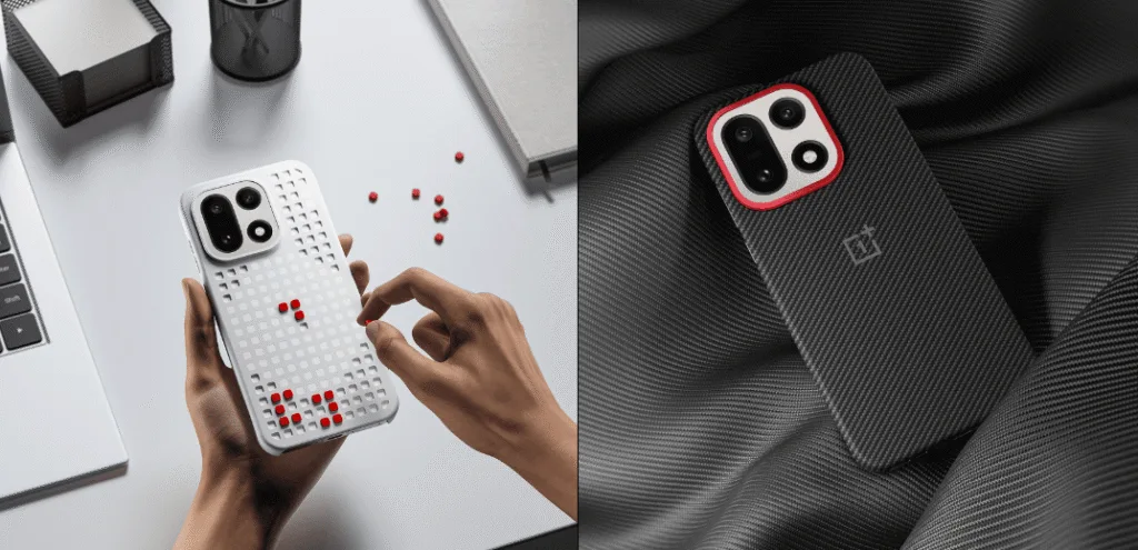 A OnePlus também oferecerá três capas próprias, incluindo a interessante Capa Magnética com Padrão de Furos que lembra designs de PC gaming com quadrados de borracha vermelha que podem ser encaixados para criar padrões personalizados. Esta capa também possui bobina magnética interna similar ao MagSafe, permitindo usar carregadores magnéticos incluindo o AirVOOC magnético de 50W da própria OnePlus.