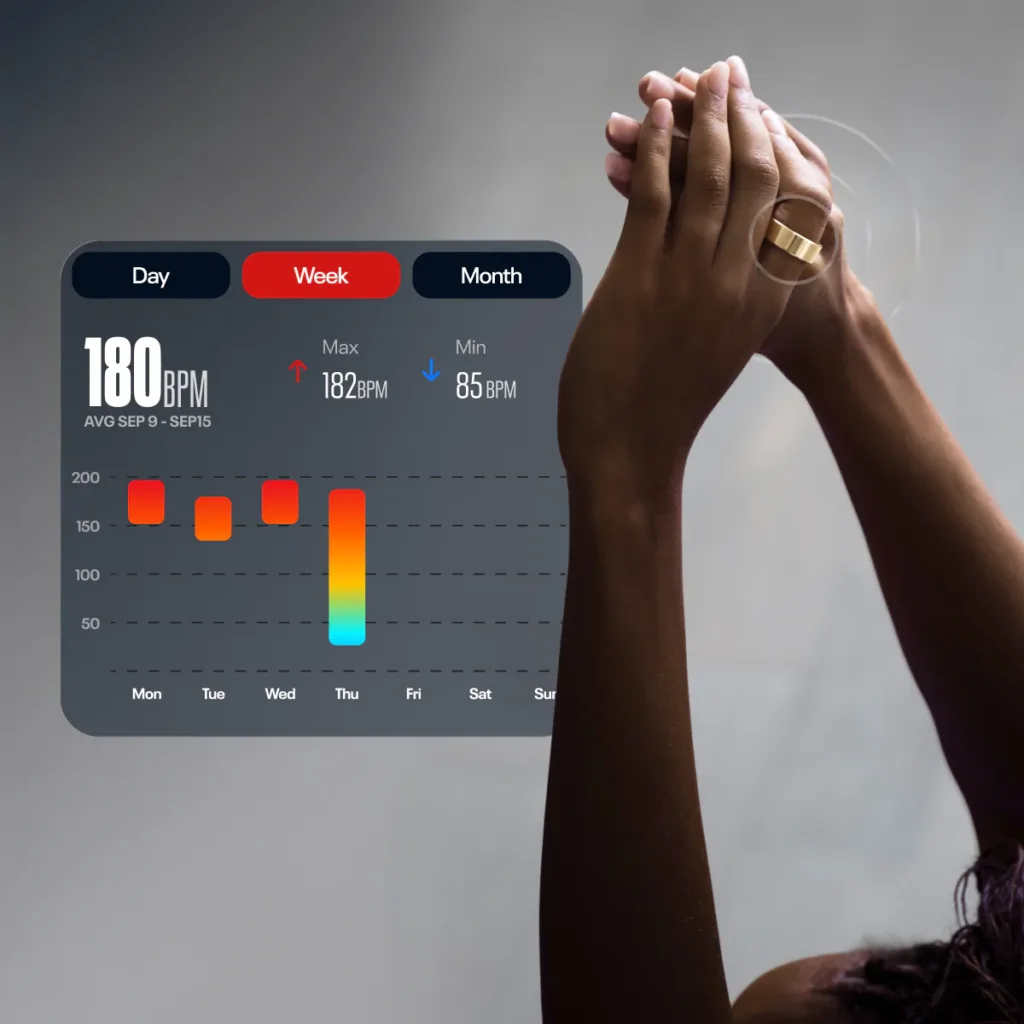 O design é intencionalmente minimalista e discreto. Disponível em três acabamentos, preto fosco, prata fosca e dourado brilhante, o anel funciona tanto como acessório de treino quanto peça que você pode usar confortavelmente em ambientes profissionais ou sociais. Não parece um gadget tecnológico. Parece simplesmente um anel moderno.