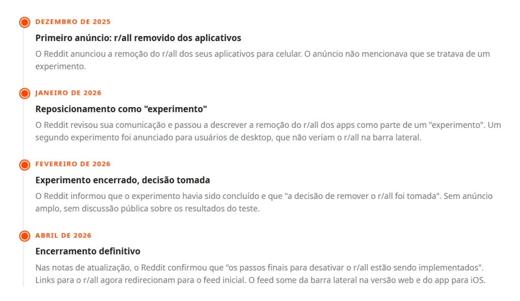 O Reddit não simplesmente acordou em abril de 2026 e decidiu encerrar o r/all. O processo foi gradual, testado e comunicado em etapas — embora com certa inconsistência na forma como foi apresentado ao público.
