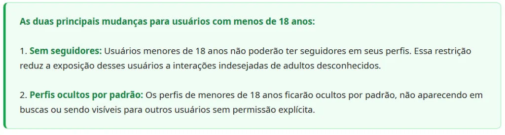 Isso significa que os perfis de menores não aparecerão em buscas nem serão visíveis para outros usuários sem permissão específica. As mudanças fazem parte de esforços de proteção de usuários jovens na plataforma.