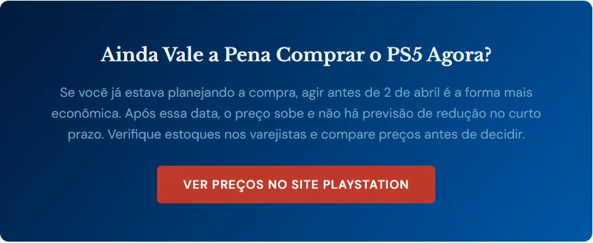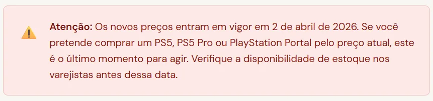 No dia 27 de março de 2026, a Sony confirmou oficialmente um reajuste global nos preços do PlayStation 5, do PS5 Pro e do PlayStation Portal. Os novos valores entram em vigor na próxima quinta-feira, 2 de abril, e o Brasil também está na lista.