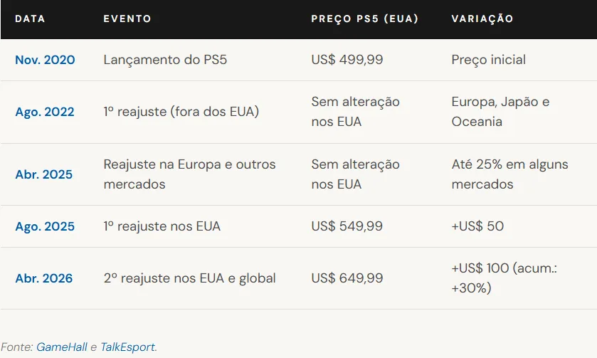 No lançamento, o PS5 com leitor custava US$ 499,99 e a Edição Digital, US$ 399,99. Com o reajuste de abril de 2026, esses mesmos modelos passarão a custar US$ 649,99 e US$ 599,99, respectivamente, representando aumentos acumulados de 30% e 50% desde o lançamento.
