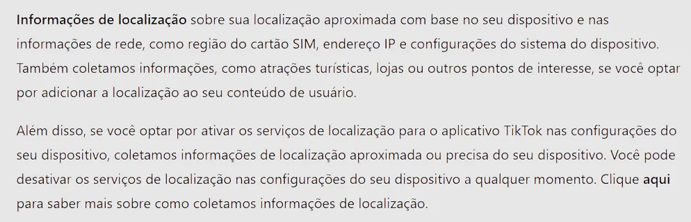 A terceira mudança é nova mesmo, não apenas uma divulgação mais transparente de práticas antigas. O rastreamento de localização na versão antiga do TikTok era baseado em localização aproximada através do seu endereço IP. Agora, o novo TikTok americano implementou rastreamento preciso baseado em GPS.