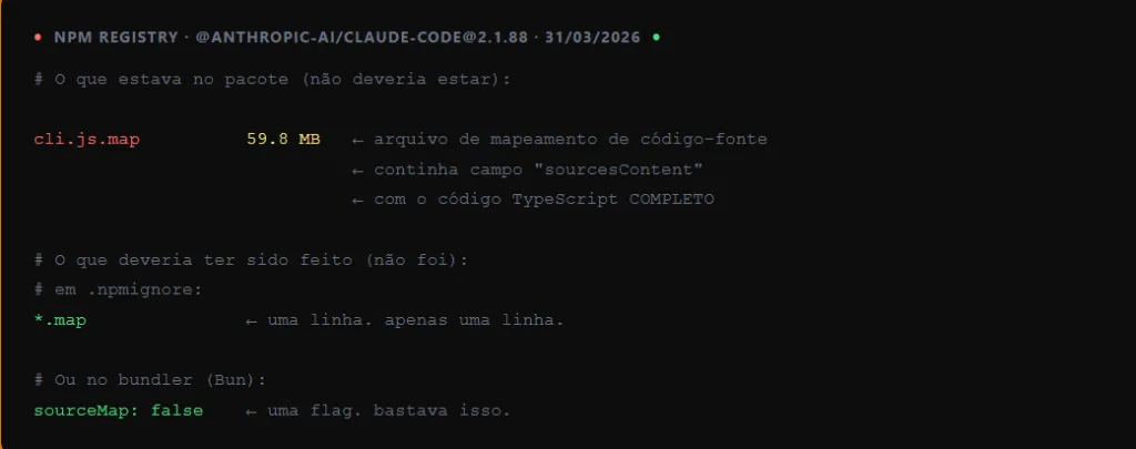 O resultado foi que a versão 2.1.88 do pacote oficial @anthropic-ai/claude-code chegou ao npm carregando um arquivo chamado cli.js.map com 59,8 MB de dados que apontavam diretamente para um arquivo ZIP no bucket de armazenamento em nuvem R2 da própria Anthropic, acessível publicamente sem qualquer autenticação.