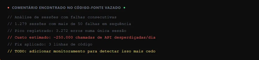 Mas o dado mais desconcertante veio do próprio código. Um comentário interno registra que 1.279 sessões acumularam mais de 50 falhas consecutivas numa única sessão, chegando em alguns casos a 3.272 erros, desperdiçando 250 mil chamadas de API por dia. O conserto para esse bug eram três linhas de código.